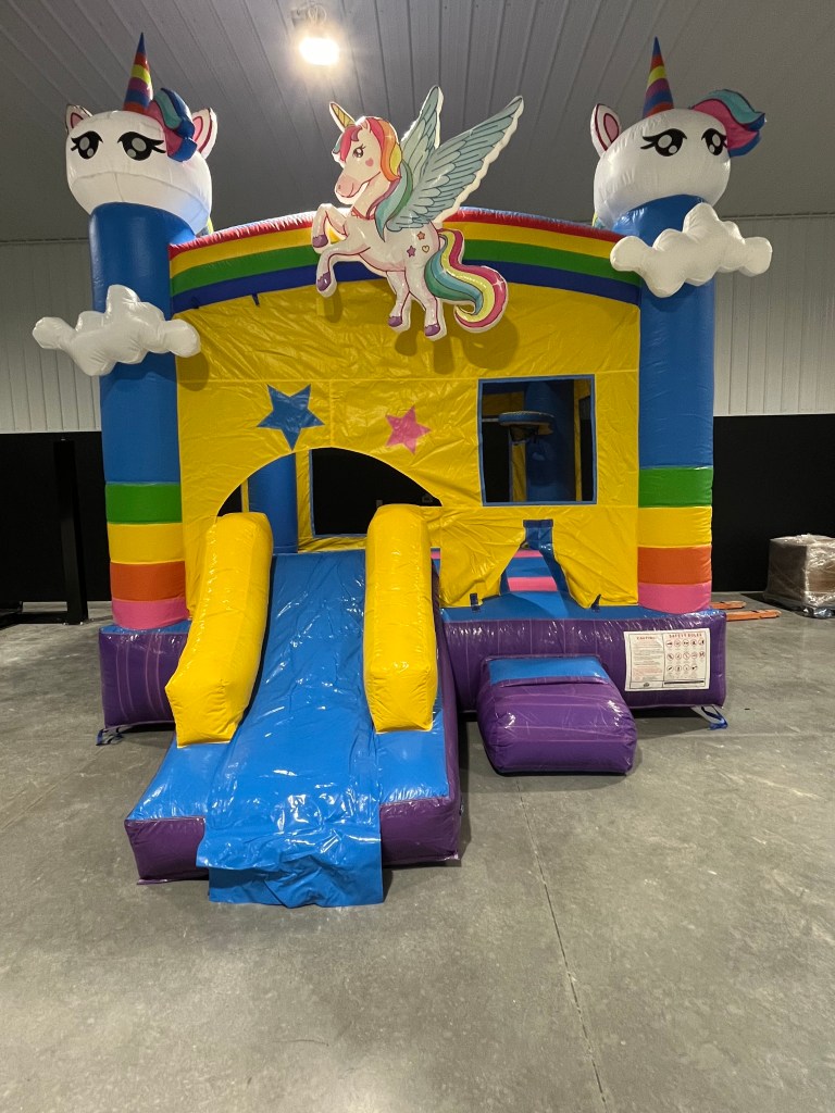 Check out our unicorn combo! This unit has the option to be rented wet with an attached pool, or dry. Unit includes a basketball hoop inside for additional fun while jumping! This unit is 13 feet wide by 23 feet long base dimensions,13 feet to the top of the towers, with an overhead mesh shade roof.